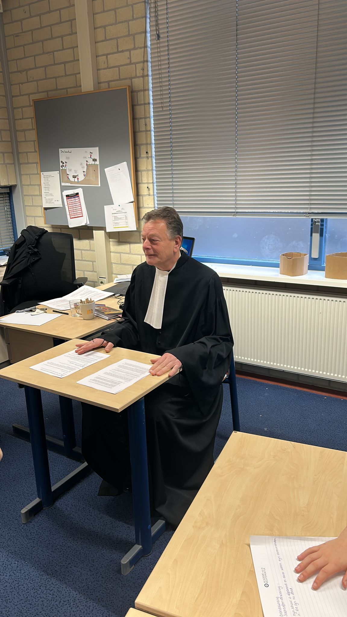 Onder de bezielende leiding van ‘onze’ Marrie en Juf Marijke doken de leerlingen in de complexe wereld van het Nederlandse recht. De leerlingen kregen twee pittige casussen voorgeschoteld waarbij het morele kompas flink op de proef werd gesteld.